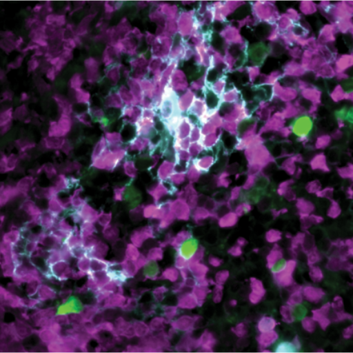 Das Bild wurde 24 Stunden nach der Übertragung der CAR-T-Zellen aufgenommen. Die grünen Punkte zeigen die ersten CAR-T-Zellen, die sich zum Tumor bewegen. Zusätzlich ist ein Netzwerk (blau) sichtbar, das wahrscheinlich unterstützende Strukturen oder andere Zellen des Gewebes darstellt.